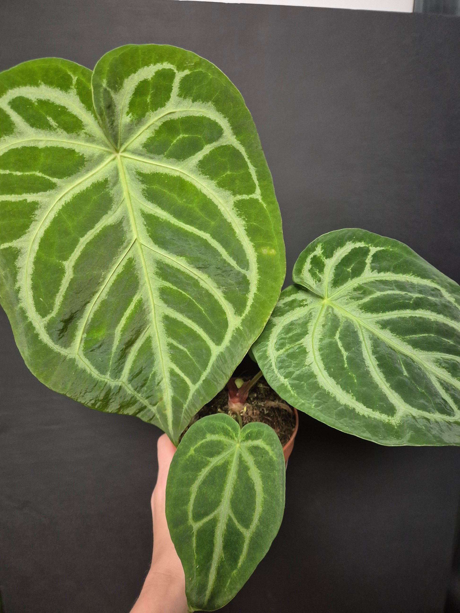 Anthurium Clarinervium is a visually stunning houseplant prized for its thick, velvety, heart-shaped leaves etched with bold, white veins. The deep green foliage has a rich, suede-like texture that contrasts dramatically with the bright vein pattern, creating a refined, architectural look. This plant brings a touch of tropical luxury to any well-lit interior space.