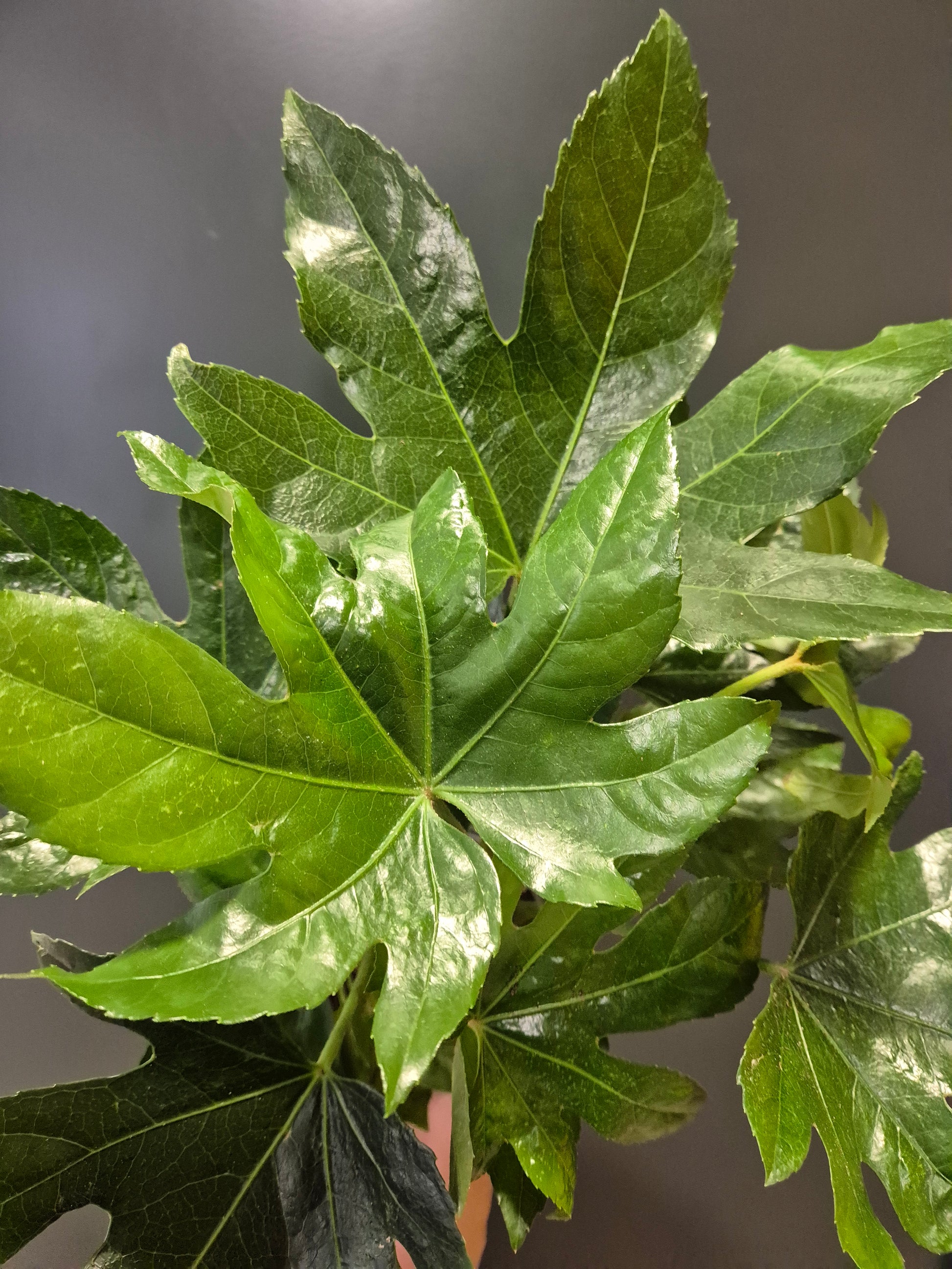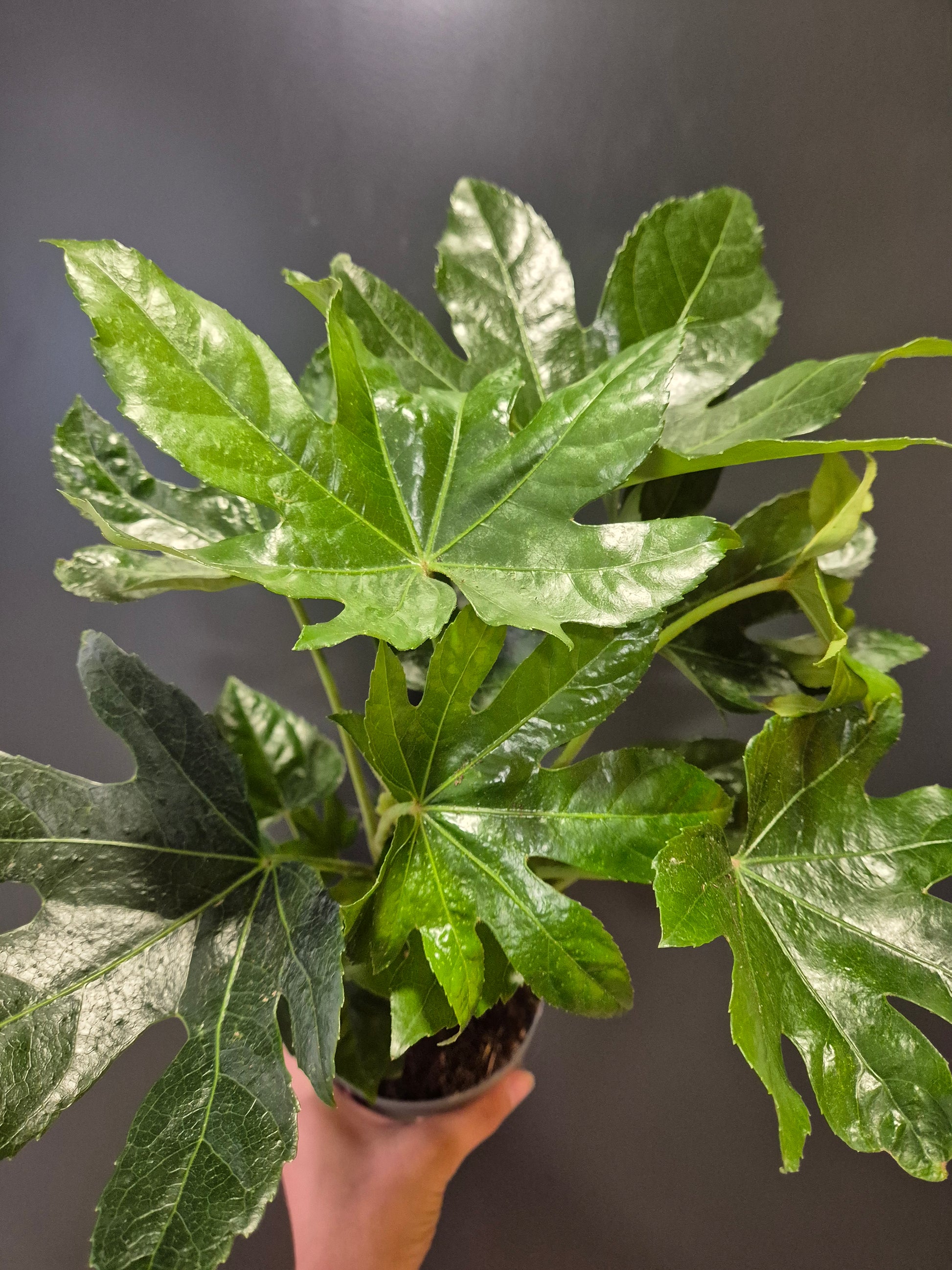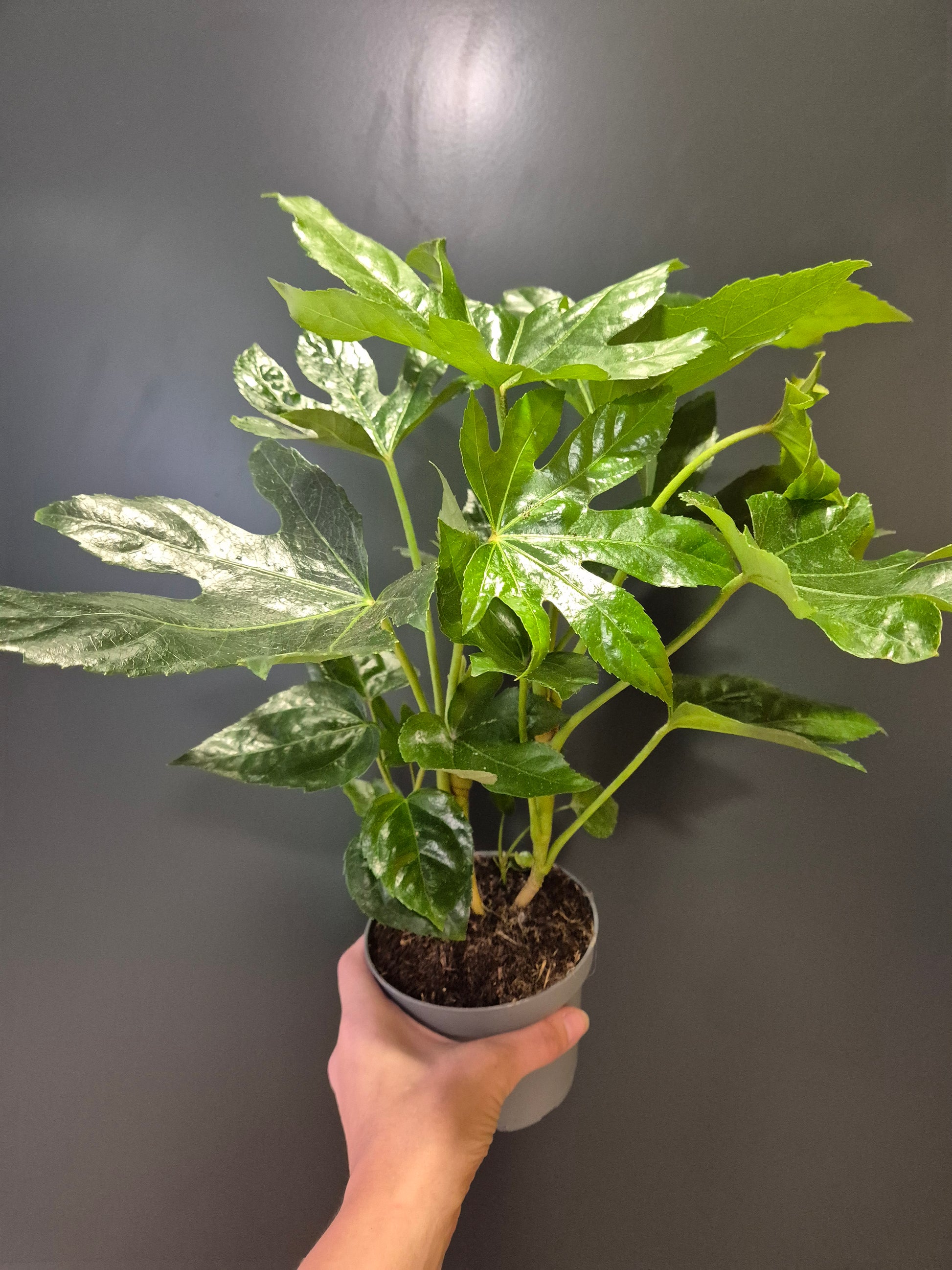 The Fatsia japonica is a striking houseplant known for its large, glossy, deeply lobed leaves that create a bold, tropical look. Thriving in bright, indirect light but tolerant of lower light conditions, it prefers well-draining soil and regular watering, allowing the topsoil to dry slightly between waterings. Its lush, architectural foliage makes it an excellent choice for adding greenery and texture to indoor spaces. With its low-maintenance nature and dramatic appearance, Fatsia japonica is a perfect statement plant for homes and offices.